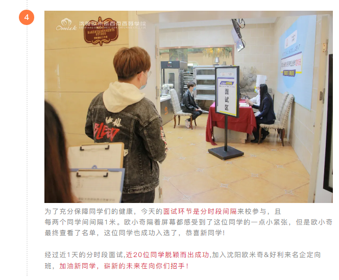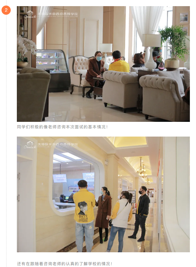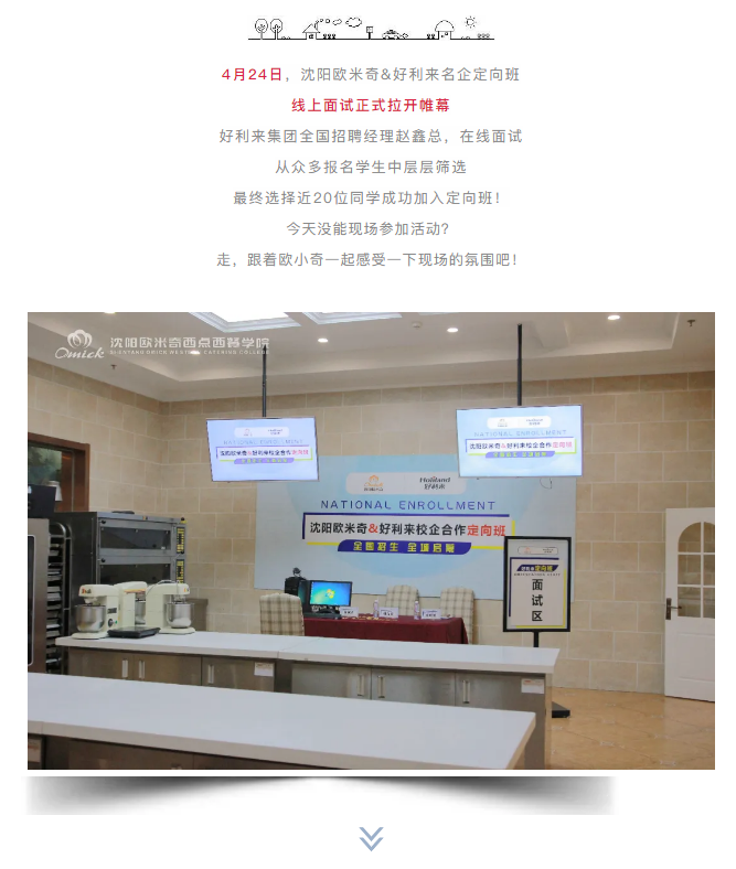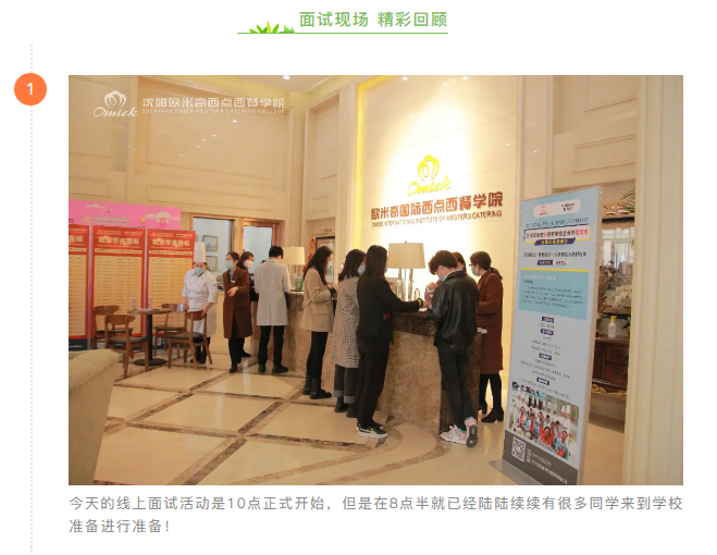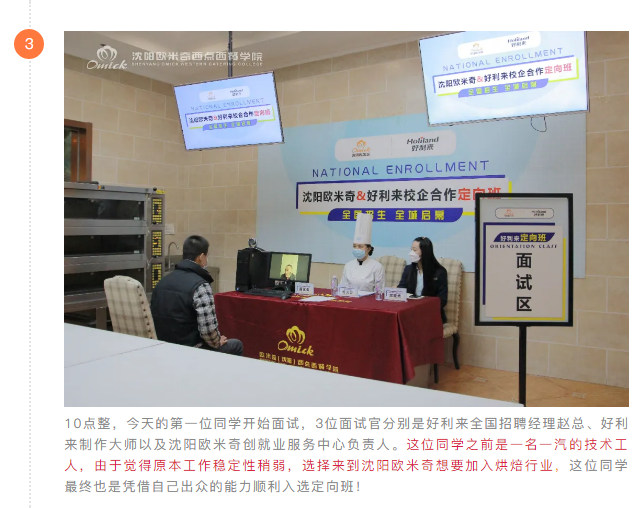 沈阳欧米奇&好利来定向班面试活动圆满落幕!恭喜以下同学面试成功! 2020-06-02 浏览 学技术,更多人选择沈阳欧米奇 上市品牌:股票代码00667.HK,实力强; 央视推荐:CCTV1、CCTV6联合推荐,更专业的西点烘焙学校; ♦产品前沿:已有多款产品获国家发明专利; 就业推荐:2万+家合作单位,毕业推荐就业; ♦创业帮扶:前、中、后三位一体,专业团队守护你的老板梦;