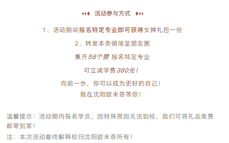 沈阳欧米奇都将送出女神大礼包一份内含如下礼品